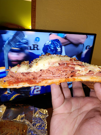 Grab pizza from a pleasant and friendly host. Driving down the road I grab a pizza sauce is ok pretty plan, Cheese has a good taste but why does the pepperoni taste so bad. Pull over and look at the Pizza.