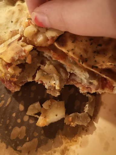 I'm visiting friends on my vacation, and we tried this place as it was near her house. We were told 30 minutes, we were late, and my friend still had to wait for 10 plus minutes to recieve the food. We got a calzone each, and were excited to try it. What is wrong with the bacon? It's mostly fat, and the pieces that are not fat, are gray in colour. I ate most of it before I noticed the off colour. I thought it tasted weird as it was mostly bacon fat, but has it gone bad? Here's to hoping that I don't get sick...