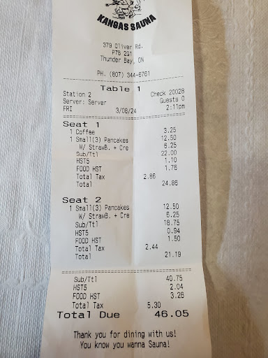 Read moreAbysmal service and terrible food! We went to Kangas Sauna for breakfast a couple weeks ago because I'd heard this place serves gluten-free Finnish pancakes. I had high hopes, but they were soon smashed to smithereens. On requesting the gluten-free Finnish pancakes, they said "No, we only do that on special occasions". Whaa?? How ridiculous. You either serve gluten-free Finnish pancakes (crepes) or you don't. I guess our occassion wasn't special enough.. So, we orderd from the menu.. My wife ordered poached eggs and they arrived completely overcooked (solid). Not soft or runny at all. Then my one son ordered eggs fried medium (he hates runny eggs) and they arrived completely runny. He was grossed out and didn't eat them. My other son and my daughter-in-law ordered the regular Finnish pancakes and they barely touched them. They were unimpressed. The server never checked on us and never even offered a coffee refill and, when asked, it took her well over 10 minutes to get back to us. The restaurant was virtually empty! My family said I should've cooked for them as I make fantastic gluten-free Finnish pancakes (even better than Hoito's non-GF pancakes) and I actually know how to cook eggs! LOL Sadly, we will never go back to Kangas Sauna. Makes...