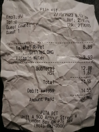 Read moreExcellent food, I had the grilled bbq steak pita and it was amazing. As far as pita pits go this one is pretty big and fancy / well decorated. Pricing is great (mine was $9.69). I'd recommend arriving before 11:30 for lunch as it can get busy. Staff were moving as quickly as possible and the restaurant has lots of them, the only bottle neck in my opinion was the customers choosing the contents of their pita (can't do much about that). Only complaint I have is some of the booth tables inside were a little messy but we just went to the tables instead. Overall I'd recommend this pita pit. Edit: There is free wifi here...