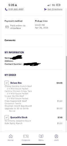 Read moreI got Taco Bell last night, first time at this location, I will NOT be back. I ordered a Pepsi, steak and queso crunch wrap, and a chicken quesadilla. I got the drink and they asked me to pull ahead that was that 5:47 PM according to my bank timestamp. An employee was running food out to the cars, every time he went by he was looking for the right vehicle to drop food to. I seen several times that he handed food to people, he would walk away, and they would call him back and say it wasn’t their order, so he would go to the next car and try to give them the food. I seen one bag go into three cars which had three different peoples hands on it and then he finally just took the food into the parking lot. I couldn’t see what happened to it from there by 6:15 he walked by and I told him that I would just like my money back. I couldn’t wait any longer for the food, he told me that he couldn’t give me my money back and he would be out in just a minute with my food. He went back in hot food brought it out to me and it was my order so I said thank you and asked why it took so long because at this point it was 630 he said they were terribly understaffed. I drove away and pulled out the steak and queso crunch wrap and it was so cold, but I was not going back to get it fixed because at that point I had spent 45 minutes sitting there waiting for food. I then stopped at Wendy’s, grabbed a chicken burger, which was hot and fresh, and drove home. Very...