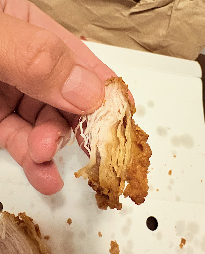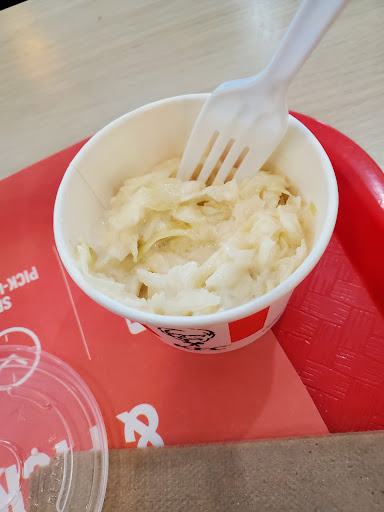 My dinner that I ordered was simple, three piece strips with fries, a seven up in a bottle and some coleslaw. I drove two blocks and sat down to enjoy my meal. The fries were cold, there was no dipping sauce, nor did he ask if I wanted any, i had two strips and some strange peace as a third. The first two pieces were fine, the third piece did not even have any meat in it, it was strictly bone skin and grizzl covered in kfc's famous breading. Overall not impressed, this is not the first time that anything like this has happened at this location. Unfortunately, i'm a sucker for punishment, and i'm always hoping that things would change. Please be warned as to the quality of products coming from...