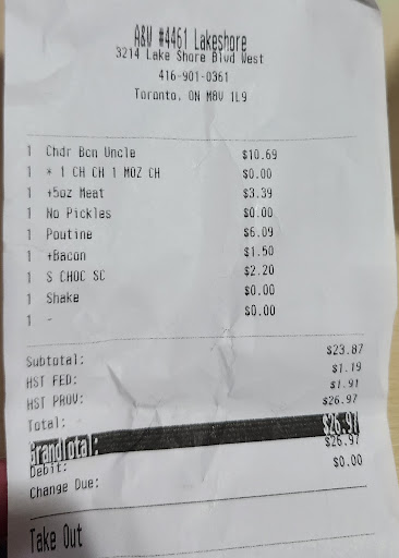 When I first arrived at this restaurant, I was happy knowing an A&W was opening across the Humber Lakeshore college. I placed my order and everything went well, ordered 4 wraps, a teen burger combo and even saw on the screen just to make sure that's what was punched in. There was only one person in front of me that ordered food for her daughter so there was no rush at all in this restaurant.