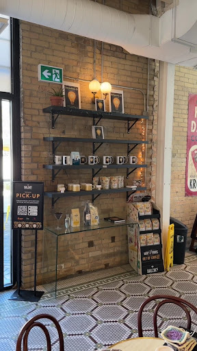 The seating area is spacious, with a mix of large communal tables and intimate booths, making it ideal for both solo visits and gatherings. The shelves are lined with specialty products and coffee blends, giving the space a boutique feel. Their refrigerated section is stocked with fresh salads, sandwiches, and drinks, catering to a variety of preferences.