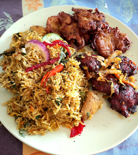Delicious boneless chicken biryani, onion bahji and chicken pakora!!