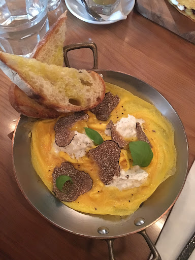 Delicious!!! Unique Italian style brunch. A depart from the usual pancakes and eggs benedicts. We had the Al forno - the warm toasted bread that we dipped into soft egg yolks with pesto was surprisingly good. Also had the stuffed foccacia with porchetta, it very filling and quite heavy, definitely a man's meal. For dessert, we had budino- warm bread pudding with crisp edges and pear chutney and creme anglaise, was out of the best bread pudding rendition we've ever had. Since we are such glutton, despite being so full, we also had the a rich full bodied Americano and a crespelle, my oh my .. this light and crispy pancakes was the best part of the meal, I can't quite describe what I was eating trust me and just order it! You'll be happy you did. The server was very pleasant and took time to explain the food in detail, we appreciate the friendly attentive service. The decor is unique mix of minimalist industrial with echoes of modern classic elements that gave warmth to the ambiance. Washroom are very spacious, clean. Happy experience and...