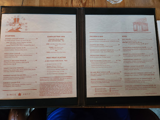 Read moreBarque surprised us in many ways. First with their forward thinking when it comes to tipping. They pay their employees enough to not need tips and are proud of it, as they should be. Of course, this comes with the food prices being a bit higher BUT the quality is worth it, I assure you. Before I get into that though, the other way they surprised us was with how humble they were about the mistakes they made. For some reason our order took forever to come out, so much so, that the table next to us got their order first even though they arrived a lot later than us. We were understandably upset but they were super apologetic and at the end of our meal they offered to take 50% off our order total. I've gotta say though, the waiters did seem a bit inexperienced, they would often forget to bring us things we asked for and we'd have to ask twice for it. So I would take half a star away for that if I could, but I'm sure they'll get better at it quickly. I want to emphasize how much the food made a difference in this entire situation, it was absolutely amazing. The brisket especially was the best brisket I've ever had, fall-apart-in-your-mouth and super tasty... amazing. The ribs with the Obama sauce were delicious as well and then we had three of the sides, shoestring fries were fresh, crispy, and perfectly salted, the mac n cheese was creamy and perfectly cheesy, the coleslaw was a bit too watery for my taste but it still tasted great, oh and we had Kansas style wings as a starter that were cooked to perfection as well. Other than the menu, the only thing I remembered to take pictures of was the wings, I was too hungry by the time we got the rest of our food and I'm sad I can't show you what it looked like but you won't regret ordering any of that. My mom had the pulled pork and loved it as well. I don't think you can go wrong with anything on the menu, really. Enjoy. And I hope you don't have to wait as...