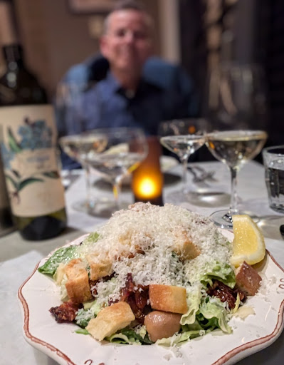 Entree Pan Roasted Salmon: The salmon itself was cooked perfectly. Salmon skin was the best part. It was very crispy I normally don't like salmon skin but I couldn't deny it this time. Their CAULIFLOWER COUSCOUS was very good. It went well with BLACK TRUFFLE VINAIGRETTE. Really love ! . Steak: My husband chose STEAK for his main dish. I actually didn't touch it except potatoes on the dish . I don't eat beef. I can't explain how steak was . Based on his opinion, the steak was a bit tough to chew. It was an ok dish. The presentation was good . Potatoes were tasty. However, he said he was more interested in my salmon dish . He liked his paring wine though. It was "2012 Gabbiano 'Solatio', Toscana, IT ."