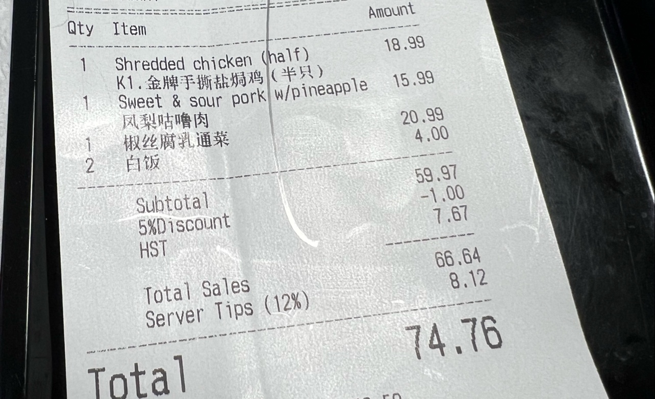 Comments : First time dining in at this resto. We came around 8:30pm on a Thursday. As of time of writing, the resto has been open for maybe 3 weeks now. It seems they are still working out some of the kinks. They do not have their up to date menus yet. There are white stickers at the bottom of the dine-in menus when you flip open the cover. Noting that that there is an extra $1.00 added to each menu item on the menu due to inflation. Our table server did not mention this aspect. I learned about this from a negative Yelp and Google review for Blooming Garden. Also Debit/Credit card paying customers be aware!!! There is a 12% mandatory service fee already applied to your bill so DO NOT DOUBLE Tip!!! I also picked up a copy of their take out menu. The item breakdown you receive is not in English. I think there is also some price differences between their dine-in menu and their takeout menu. Example we ordered their T1 Fried tofu, on their dine in menu it was listed as $7.99+$1.00 inflation charge for a total of $8.99. On their takeout menu the same T1 is listed as $9.99, not sure if the $1.00 inflation charge applies on the takeout menu as well. Be careful when ordering Take away, you may be getting charged slightly higher. If you are managing Gout, it will be a challenge to eat here. Free dessert served at the end, which we declined.