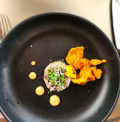 Ahi Tuna Tartare Good pairing of raw tuna and avocado. There is a nice – and too often exploited, - texture contrast between thin crispy sweet potato chip and soft tuna-avocado mix. It was good, but not impressive.