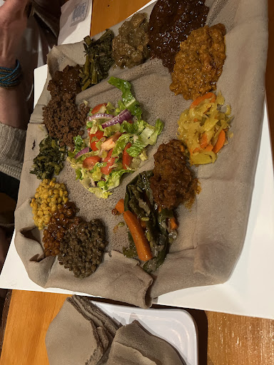 I was visiting from out of town, wanted to try a local Ethiopian restaurant, and wound up at Blue Nile later on a Saturday afternoon. At my home city's Ethiopian restaurants I typically order the vegetarian combination, and that's what I got here, with Ethiopian injera. My food arrived quickly and was quite delicious, and the server explained the difference between "Ethiopian" and "standard" injera. If I understood correctly, the Ethiopian is either made with only teff or a special kind of teff, and the server, who was very friendly and helpful, brought a sample of the other style so I could compare. I definitely preferred the Ethiopian style, which is darker in color, lighter in texture, less spongy, and richer tasting than the standard offering, so I learned something new after many years of eating Ethiopian food. I hope I have the chance to visit again on a future...
