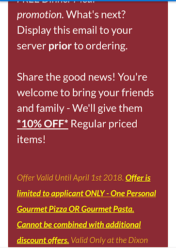I was sent an email saying I won a free pasta or pizza at this location, so rather than going to our usual queensway location the family and I went here. We popped in on a sunday at 230ish and was greeted kindly by the host. Once server arrived i showed her my email and she immediately dismissed it by saying it was only a half portion which was fine with me because the family was order sides and apps. I put my daughters meal in before drinks and it still came extremely late. Server told my husband he could only get the fixed sides which has never happens before at any location. My husband physically got up to ask for a pepsi refill and for sidesplates for our app. The server told us she brought the food out hot (late mind you with only one other table dining) and said our garlic toast is coming. We never recieved or saw her until the end of meal which she brought out 4 burnt toast..?? All of those problems could have been swallowed if server didnt try ro charge full price knowingly last minute after waiting 10 minutes for bill, and our child anxiously crying. I asked for the manager and he slowly came giving me attitude telling me i had to email the email the sent to get the discount . When i asked where to send it to he told me the server provided it, in the nasiest tone. My husband had to interject and explain she didnt tell us. All of this while standing waiting to pay and leave. Our child in tears and the manager went to change bill in the slowest manner possible. I didnt even want to fight for the 10% off for family, they promised me twice in email.