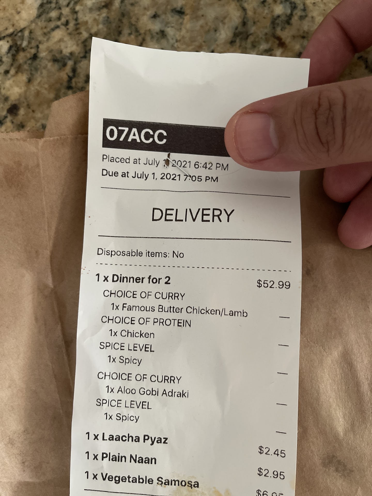 However, I do have some feedback I hope they’ll address. My first order was cancelled after waiting 1.5 hours, because the weight of the food caused the thin paper bag to rip and all fall out on the floor. I had to reorder and the delivery driver warned me to hold it from the bottom I could tell it was much too heavy for the thin paper bag. Please make sure you are spreading it out over multiple bags or using sturdier bags, or even warn delivery drivers to hold from the bottom!!! In this case 4 heavy mains + 3 naans were in one relatively small/thin paper bag. There are many options like spreading this into 2 bags or using plastic/canvas bags for large orders, etc. I hope this doesn’t happen again so that I can continue to order delivery.