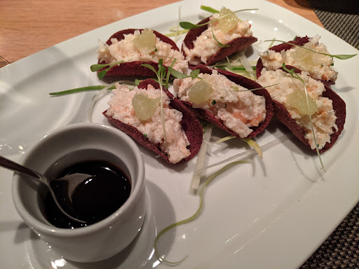 I would have given this a 5 star review but 2 things about my experience lowered the overall rating. But first, let me vehemently say that the food is delicious. Everything is full flavoured, well balanced (not too salty or sweet or spicy), the textures are amazing and the portion size is great. But for $230 (after tax and tip) for 2 people ordering 1 appetizer, a bottle of water, 2 mains, 2 desserts, 2 6oz glasses of wine and 2 coffees....I expected an elevated experience to match the quality of the food. The 1st improvement was the temperature of my main dish. I had the herbed gnocchi with duck confit and chanterelle mushrooms. My husband had the grilled orata which arrived at our table hot. It was delicious. My gnocchi was room temperature, which was disappointing. The sauce on my dish even had a skin on the top, which is further evidence that my dish sat waiting for the fish. Don't get me wrong, everything was delicious and once I mixed the sauce, the skin disappeared but the dish would have been a 10/10 if it were hot and timed better with the fish. At room temp, the gnocchi is a 7/10. The 2nd disappointment was the timing of our cappuccinos with dessert. We wanted to enjoy coffee with dessert, but our 2 desserts came out 10 min after our coffee so our coffee was tepid by the time the dessert came. I would have liked the 2 to come out together or at least closer together to be enjoyed simultaneously. And the desserts we had did not require heating (the Bymark chocolate bar and the pumpkin layer cake with apple spiced ice cream.). Another small improvement also would have been the inclusion of 2 toasted ciabattas with the burrata appetizer. It was a shared app but only 1 piece of bread came out, it would have been great if both of us could have a full piece of bread with the cheese. Aside from these things, everything was DELICIOUS. The dessert was light (even the chocolate bar) and not cloyingly sweet, which was a great way to end the meal with something light and sweet. And the service is very good, they clear the plates quickly, and don't overwhelm you. Water is refilled quickly and its the perfect level of attentiveness. Oh and the shrimp tacos were on the house!! Which was a pleasant surprise, especially since this was our anniversary dinner celebration. The shrimp tacos were like a shrimp mousse with chunks of shrimp and then topped with something very citrusy, which was delicious because it rounded out the flavour profile very nicely. Perhaps, I'm being too picky about the temperature and timing because the restaurant was full (I'd estimate 95% capacity for a Thurs evening) so I'm sure timing everything is a challenge. Bottom line, I would come back here again for the awesome food...