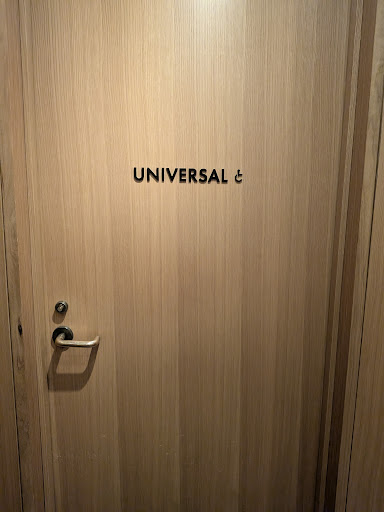 Pop art hellscape. At the entrance, you’re greeted by a massive, glittery blonde with a stare that haunts you through lunch. Inside, another wall looks like Skittles exploded in a geometry class. The “Universal” bathroom sign tries to be woke chic, but comes off like set design for a Scandinavian thriller.