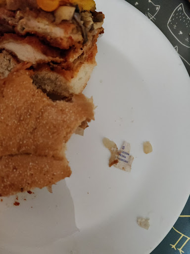 In August of 2024 we picked up two sandwiches from this location. Upon biting into one of the sandwiches, a foreign item was found in between the layers of chicken (photos provided). I called this location the next morning and spoke to Samantha via a text exchange and showed her the pictures. After speaking with her manager, she profusely apologized and said she would note down my name for a free sandwich and olives on our next visit.