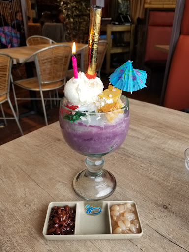 My friend was absolutely shocked when our desserts arrived at our table. We got the mango sago and the Ube cheesecake and the portion of the cheesecake was the size of a small cupcake that you would get at Walmart. The mango sago was also in a small cup, maybe about 125 ml. As we were starting to taste it, the (presumably) owner went around and asked everyone if everything was okay. We said we were okay and she noticed that we were only given one spoon and one fork but the sago was not thick so she asked if we needed another spoon and we said yes please. it really disappointed us because as we waited for the spoon, we tried to wave down a server to see if we could order an additional larger ube cheesecake but that was when we realized then that no one come once to check on how our food was tasting except for when (presumably) the owner came. We couldn't get a hold of someone for 20 minutes, by then, my friend has given up on asking for the cheesecake. We also had to ask for the spoon again after we finally got someone and by that time, I just asked for the bill because I didn't know if we could get their attention again. (1.5/5)
