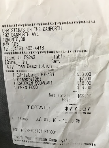 Read more0/10 stars. Went to this restaurant to dine in during the taste of danforth and was the worst service I have ever had in my life. Granted it was during a very busy time due to the festival, and I could tell the tensions were high with the staff, but that is no excuse for being blatantly ignored by every single server while other tables are being serviced who came in after us. It was so bad to the point where a food runner felt bad for us, and took our order/served us. It took them 45 minutes to take our order after being seated, we asked around 2-3 times for a server to come to our table, no one came until we asked a food runner to bring a server over, he got on that right away and told someone but not one came so he ended up taking our order. So after we placed our order it took another 45 minutes to get our calamari appetizer which was horrible and cost $26 for only 6-7 pieces. Then it took another 30-40 minutes to bring our mains just as we were about to leave and put money on the table for the calamari, I see the servers rush to give us our mains. My chicken Slovakia was burnt to the point where I didn’t even enjoy my meal. To top off my experience when I asked a server, serving the table beside us for our bill, he was asking who served us and we told him it was a food runner who took our order since no one came up to us. He then began raising his voice being like “who took your order?!” We we’re baffled as to why he was raising his voice at customers who’ve done nothing but been patient with this whole experience. As a server, you should go an figure out who took our order rather than raising your voice at customers. Finally a manager I believe took our payment and she was cold and made us feel even more unwanted. I am very shocked at my experience here, I never been bluntly ignored like this. Everyone was being serviced at this restaurant but us, it felt as if it was very targeted. Never...