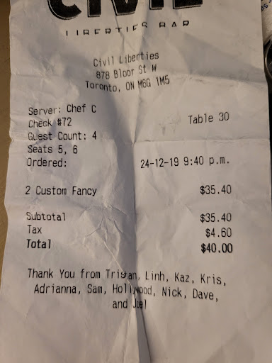 Crowded standing atmosphere, an uninviting attitude, and underwhelming drink portions but tasty drinks. Was meeting a group of friends at Civil while we waited for our reservation at Miracle bar across the street. As I walked in, I told the host where our friends were by the projector screen, which was showing sailor moon episodes. We walked over to our friends and joined the group. It was standing room only and the place was very busy. People kept bumping us as they walked by and I was even told by one of the servers to not block the laneway which I was already trying to not do but literally had to be hanging on to my girlfriend to cram as close to the wall without disturbing others. We weren't going to be there long. My girlfriend wanted to go vape, so we stepped outside. When we came back in, we found out that the staff had checked to see if we were actually friends with our group. Not a very nice thing for the staff to be doing on the holidays. And I wouldn't have pushed into someone's space if I didn't know them as it was tight enough as it was. It took a while to track down a server as they were busy. Thought the mixologist theme was good until I ordered and received the tiniest goblet, which looked about 2.5 ounces of liquid could fill. I made fun of the glass as I'm a big Guy and it looked like a shot glass in my hand as it was only half the size of my hand. I figured the mixologist would at least make me something that was in a glass more suitable to my size. I didn't get a garnish on my drink either. My gf's drink was in a regular highball glass, which I would have preferred. The drink was well made despite the two sips it took to consume it. The price was a little more for the mixologist concoction and falls in line with most bars $17 a drink these days. There was a really nice mixologist there that helped my gf as she got dizzy when we were about to leave, most likely due to low sugar levels. My gf needed to sit down, and this nice mixologist provided her with some orange slices and candied ginger. After nibbling on these, my gf felt a bit better, so I'm happy that she helped us. If that hadn't happened, I would have most likely given fewer stars for the service. Atmosphere was dark but the place didn't have any standout features besides the bottle wall behind the bar. Never saw a menu, but we were only in there for drinks, so I don't know if they have food. Posting a pic of the receipt...