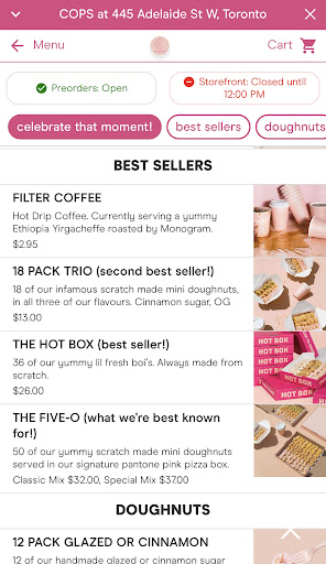 Read moreA cute little artisan donut shop practically hidden away. You barely miss it if you aren’t looking but luckily their bright pink exterior draws you in. Cops is know for making freshly made donuts everyday on order, with a surprise flavour of the day.