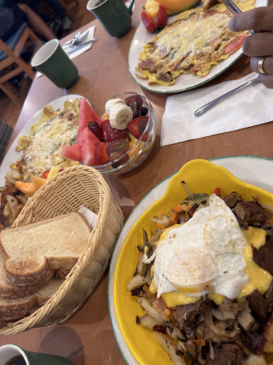 The toast served to me wasn't toast at all. It was whole wheat bread with butter not toasted, so we asked for another serving. That was after we got our server's attention as he was in the midst of cleaning the floor with broom in hand at the other end of the restaurant. Off he went to get it along with a cup of coffee. I said to my spouse, "I wonder if he will wash his hands." We watched him and Nope, he didn't do that. Instead, his hand went directly into the loaf of bread, and well, you know the rest. I wasn't going to eat it. Just witnessing him do that totally grossed me out and where the heck is his common sense. Overall, this place is looking like it needs a face lift, there were too many tables without social distancing, messes on the floor not picked up at any table and stacks of children's seats randomly stacked here and there. The atmosphere is too rushed, and to have staff pushing a broom to and fro under our table, I wanted to scream get lost.