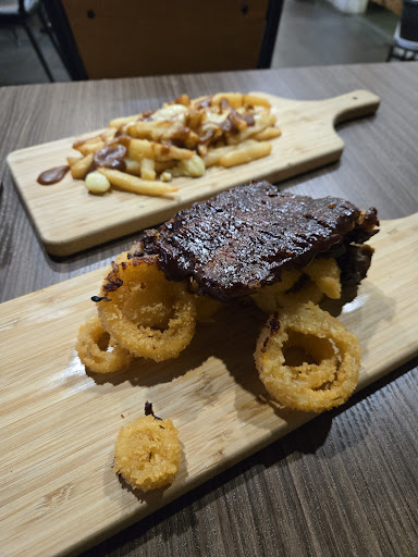 As soon as we got there we decided we wanted to sit in the patio, it was around 7 to 7:30pm. We ordered our food and asked for water assuming we would get FREE tap water in a cup. Unfortunately the waiter gave us 4 water bottles which we had to pay for almost $3 each.. The wait time for the food took SO long by the time we got our food it was past 8pm and we decided to switch to go inside the resturant because the sun was already down, was getting cold and the smell of the garbage (i think behind their building) was getting to us. I thought that ATLEAST the food was going to be good with all these good reviews but I was VERY wrong. A lot of the food wasnt even warm. My onion rings were cold. The ribs were so dry and small. I asked all my friends how their food was and they all said it was "okay" or didn't like it. The prices didn't even match the quantity of the food, def not worth the price. Plus it was served on tiny IKEA charcuterie board. My food kept falling off due to no space, it was not practical. Only things that were practical were the pasta plates and the big meals served on a bigger board. I actually cannot believe how this place has a high rating.. Not my type of food or place. No music inside but atleast the decor...