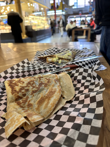 I loved this place . I loved to watch them prepare my food right in front of me . The monster crepe was LOADED with ham , cheese, spinach, onions and broccoli. It was so big it didn't quite fit in the container. .lol Later in the day after shopping around Saint Lawrence market I had to go back there for one of there desert crepes. It was simple but delectable it was banana. .chocolate and whipped cream. The staff is a bit shy but they really do try to make what your ordering is exactly what you like . The only thing I could of done without was the wax paper in the container . I think it's there to prevent the take out container doesn't melt ,as they do serve them fresh off the special crepe grill they have . Fun to watch...