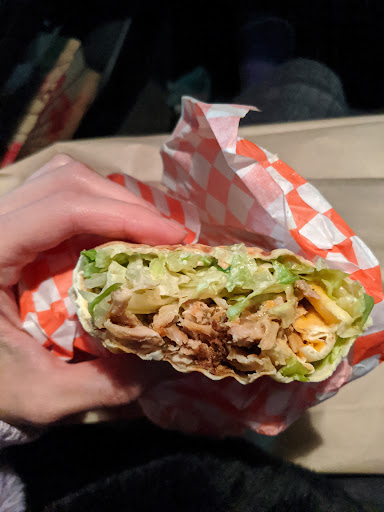 Even at 10:30 p.m., we were about 8 people waiting in a que to get their meal. Entered the place, the lady greeted really well and was patient in taking my order as I was there for the first time and I had questions lol.. Ordered, the guy making the wrap was Great too, he explained to me everything including the sauces they put in the wrap.. Great Service Fellas!!