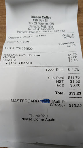Read moreAfter having reviewed the many 5-star commendations, my expectations were naturally set high for this location on Bay street. My friend and I ordered an Iced Chai Latte and a Standard Latte, both with Oatmilk. My Chai Latte, was slightly on the sweet side, while the Standard Latte had a nice rich flavor. My experience took a downturn, resulting sadly in a 2-star rating. The cause? A combination of deceptive billing practices and a notable lack of customer service by the staff. The team was engrossed in their own dialogue, diverting their attention only when someone placed an order. I later found an additional charge of 20 cents for the inclusion of Oatmilk in the Standard Latte. I went back only to be met with an explanation veiled in uncertainty â it's an automatic charge and the machine is programmed that way. Definitely left a poor taste...