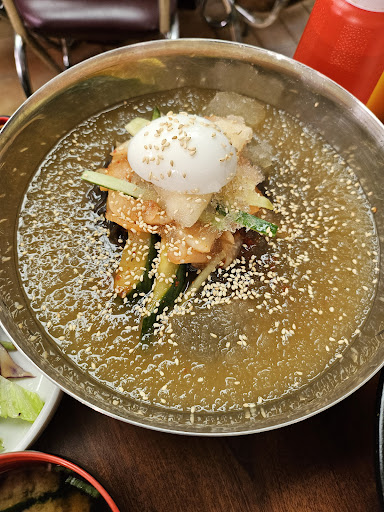 #15. Cold Noodles 8.5/10 Chewy thin noodles cooked perfectly in a light slushee broth and topped off with cucumbers, white radish pickles, Asian pear, half boiled egg, and sesame seeds. Well seasoned - comes with the usual vinegar and mustard condiments if you want a little more kick. This dish is great for the hot weather.