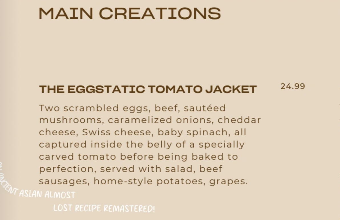 We had reservations but still had to wait an extra 35-40 mins. During this time waiting, we decided to look at the menu on the website so we could order right away. When we received the order, mine was not at all what was described on the menu on the website. I got the Eggstatic Tomato Jacket which states there is beef in the tomato and egg mix and beef sausage on the side as well. I search through the watery egg mixture and there was no beef inside and no beef sausage.