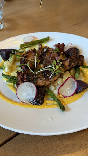 Pulpo a la Parrilla – Spanish grilled octopus served with ají panca, chimichurri, purple potato, huancaína, asparagus, choclo, and radish – a delightful dance of textures and tastes.