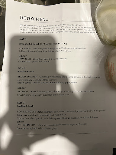 Sunday morning, I got the juice that had my name on it, the juice that I thought was suppose to be the last or only one for the detox. I went to work and got home pretty late, when I looked over the pdf form of instructions I was missing a juice called “Power House”. I decided to wait the next day a Monday to reach out about the missing product. I left a text msg w/ photos..(bc we had spoke via text Thursday night.. the night I pre ordered) and I also called.. Not 1 person has taken the time to reach out, follow up and find out the situation…. I just wanted to do it right and follow the instructions they gave me, especially bc I paid $159 for the package and missed one. It feels like if I was purchasing something I would have gotten a response MUCH faster, like Thursday night. I’m actually a little taken back and disappointed by the lack of interest in a cx concern. I have never had any issues with the owner or anyone there. I feel like I didn’t get the FULL benefits of the 3 detox and I’m pretty annoyed by that. I literally followed the instructions to the T only to be gipped the last day. Below are the pics… 1 is the instructions, day 1, day 2 and day 3 w/ the 1...