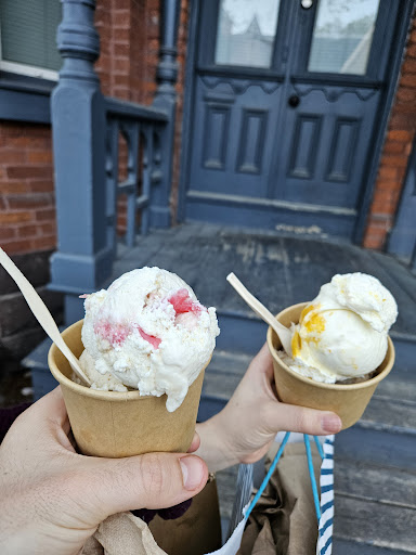 We each had a scoop of toast (sourbread dough base with Seville orange marmalade), then I had a scoop of halva rhubarb ripple (white sesame base layered with rhubarb jam and halva) while my partner had "skyr it up" (skyr with mango-amia jam).
