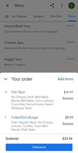 My partner picked up 3 fish tacos for himself and 1 pulled pork burger for me (pictures attached). The burger was filling, and they added a good amount of toppings on the pulled pork burger, but my partner's fish tacos were kinda empty. There could have been a little more tomatoes, cucumber, mild black beans, and corn (they were predominantly stuffed with lettuce). The fish tacos were also missing the sweet bbq sauce. They only added the secret sauce. They also did not pack the mild salsa on the side that comes with the fish tacos. But we only noticed when we got home that the salsa was missing. We were really hungry by this point, so we weren't gonna go back for it.