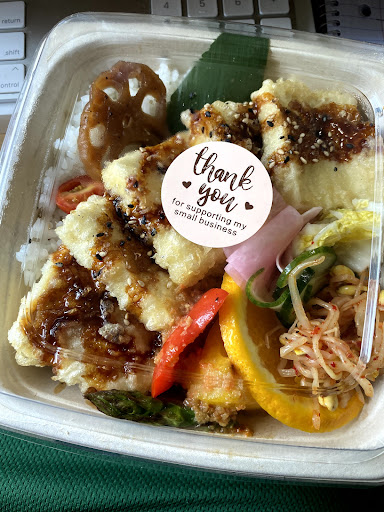 I want to mention how appealing the bento packaging was. The bentos had transparent lids, and you could see how the sides and main were thoughtfully layered and packaged together. It made the anticipation for the food even more enjoyable. The lids could be easily placed back on the container without difficulty. The containers are made of some sort of paper product while still keeping the food warm. Very user friendly.