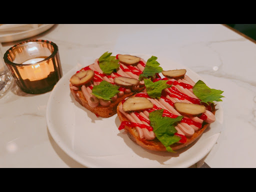 My favourite of the night would have to be the duck basteeya! I loved the crispy exterior and the flavourful filling. The shrimp toast had a good amount of shrimp paste in the middle and was delicious. Scallop crudo was flavourful and refreshing although I wish there were more Scallop for the price range. I was a little disappointed in the steak though. It felt a little dry for me and a little tough. The desserts made up for it though. I loved the mix of the matcha filling and concord grape jelly, the matcha wasn't bitter and didn't overtake the jelly, I do wish the puff was a little crispy or had some element of crunch to it. I loved their version of the sticky toffee dessert, the yogurt Chantilly really help cut the sweetness of the dessert and I loved the toasty flavour of the toasted rice which also gave a great crunch to the dessert.