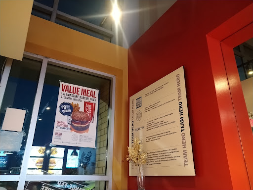 Read moreHero? Not my hero, the villains must have taken over. There are problems I've noticed from the top down about this place. Its been years since I've come to this place and the quality has certainly dropped off a cliff. The only good thing about this place is that its clean. That being said, the food, outside of the sauces, are not good. Rubbery bread, cheap tasting (probably frozen) fries, and tiny portions for the high price of all this low quality food (tiny chicken breast in the burger bun (very thin and only 3/5 the size of the bun), pop (only 3/4 full), etc. When I first had hero burger years ago, I remember it felt a little expensive at the time but you felt like you were getting quality and decent sized meals. Now many other resturants have caught up and offer antibiotic and hormone free food and have better quality stuff for their prices while these guys went the opposite way. Their menu is huge now but their quality is bad. Other than that this location needs to put more effort into putting care into the food being cooked. Undercooked onion rings are horrible and also no one wants cold food. The owner should have food sitting in a warmer bag and not under the a/c for pickup orders. Also the orders need to be checked more often for mistakes. These things demonstrate a...
