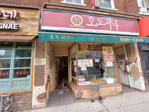 Simply the best bakery I've ever tried. Definitely a hole in a wall and not that noticeable compared to its other neighbouring restaurants and coffee shops; this bakery has such a simple menu, they know what they're good at and they do it well. The two most popular foods here are the walnut cake and hotteok. The walnut cake is just the name tells us, a pastry that looks exactly like a walnut and has fillings, Hodo Kwaja serves three types of pastry fillings for the walnut cake and you can mix the batch and they sell a bunch of these pastries for rather cheap price compared to other local bakeries (the highest one is 70 walnut cakes for $20), it's a bit comparable to Timmies in that way. The only down side to the walnut cakes are that they don't make them fresh, they don't even keep them warm, so you'll most likely taste a walnut cake that used to be fresh, bittersweet. The second one is hotteok and that's difficult to describe, but it's an amazing small hearty pancake that has syrup fillings inside, and when you bite it, it oozes out so seductively. The best part about the hotteok is that they do make them fresh, if I had to nitpick, the hotteok (which is suppose to be a street food) was really messy to eat (the fillings oozed out at an alarming rate), but i'm not too mad at the extra fillings. They don't really show their drink menus, all you would see is self serve coffee and tea (1.25 for small and 1.50 for medium, and i think 2.00 for large). But in the other side of their counter are korean drinks, which looked tasty. Overall, I definitely recommend this bakery for something other than timbits and will definitely be back...