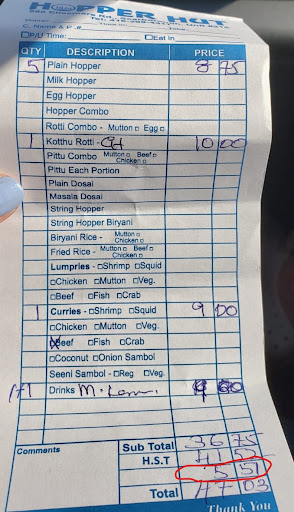 Read moreBeen loyal Hopper Hut fans since 2000, & visit Toronto from Detroit only to eat there. After 2007 it simply decayed beyond tolerance.Would still,at least make once every year eating there. Every time would decide would never to again eat there, but our earlier on love for Hopper Hut used to force us make yet another disappointing patronage. On 1st August ,hoping against hopes for a wonderful dining experience, and the name "NEW Hopper Hut"Visited for lunch. Felt sorry for ourselves for our Bad Decision;- a)extra-ordinarily long delay at service, b) the "nethili" fries were Totally saturated in Salt, to the point only the taste of Salt could be felt. c) What ever dish we ordered for ; whether Pittu Biryani, String hopper Pittu or Pittu Parotta/Chapathi were completely drowned in unimaginable Red chilly Powder. Even our family that delights in Very Spicy food could not stand it . Suggestion: Could the one taking Orders , ask for patrons Preference regarding Spiciness ie V.spicy, Spicy, Medium or Mild? d) the earlier on practice of providing Co-conut Milk for Appam ( despite or request that we would specially pay for it ) was simply a time of the past. Could see only a handful of other families there. Is it Possible that they have a really Horrible Cook, or a Cook who wants to deliberately turn away clientele by default saturating the food,with dumping of Salt & Red Chilly Powder? Still being loyal to Hopper Hut , am bringing out all these so that Hopper Hut could still Turn around for the better,if only it listens to...