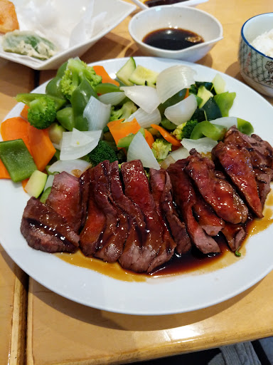 Then worst came - the food. Their menu specifies all vegetables are now steamed. I did not think it would be only steamed ... No sauce to speak of. I got, as you can see, half a plate of plain steamed vegetables. I did not go to a restaurant for something I can choose to eat and make at home myself. The meat was also tough and the only thing covered in teriyaki sauce. The tempura had the flour raw still on the vegetables and the tempura itself was without flavour. You know what the best part of my meal was? The salad. With the thousand Island dressing, and barely separated lettuce leaves.