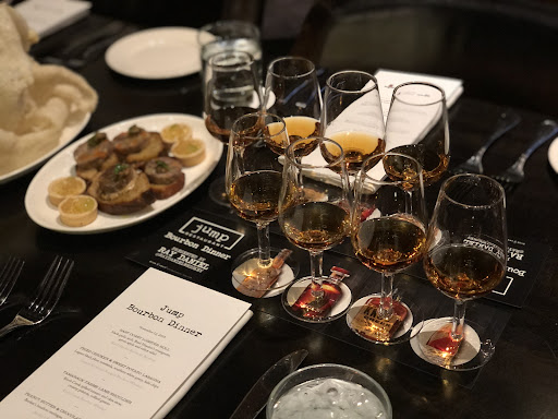Read moreWalking into the curtained off private dining area, the tables were already set up with gleaming glasses of the caramel coloured liquor. It takes will power to not slug them back before the food arrives. Luckily, everyone’s presented with a mug of Tom Collins made with Jim Beam and the table is set up with nibbles to tie us over: tasty terrine on crostini, a passable honey tarte with caviar, and a big plateful of crunchy chicharrón (its salty fattiness is cut nicely by the sweet bourbon).