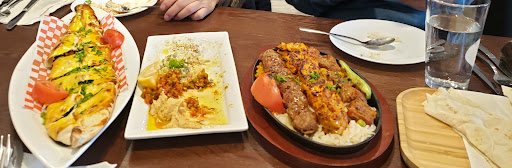 As noted in the photos (if uploaded correctly), we started with the Mix Appetizer Plate consisting of Hummus, Russian Salad, Acili Ezme (mashed tomatoes and pepper with onions & herbs), and Eggplant purée. For our shared entrée, we had the Mix Kebab (adana/ spiced beef skewer, Beef kebab and chicken kebab, served with 2 types of rice and lavash bread). For our "dessert" we shared the spinach with feta pide which was topped with spinach, feta and parsley.