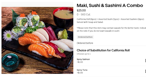 Read moremy order was Kibo Signature Roll (8pc) Rainbow Cali Roll (8pc) Unagi & Avocado Roll (6pc) Spicy Scallop Roll (6pc) Salmon & Avocado Roll (6pc)