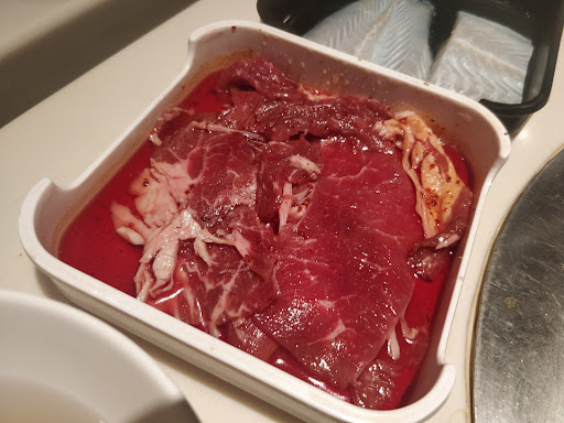The meats are seasoned well (you can also dip the meat in a sweet soya sauce that they have at each table) and are sliced super thin to cut down on the cooking time. The beef and pork slices cook within minutes. The chicken was a hit with my fam, it has a slight curry flavour. The rice is hot and fluffy, almost like the Japanese sushi rice. I like the beef broth to wet my palette as I consume copious amounts of meat. I like eating the pickled radish as it cuts the charcoal flavour of the meats. Calamari can be a bit chewy if you over cook it. The white fish is very nice, but make sure your cook it on a clean surface as it does tend to stick to the grill. Today the fish fillets were a nice big and thick cut, only 2 pieces can fit in the square tray that the food is served in.