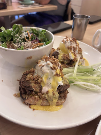 Whilst the pudding was nice, the Eggs Benny were just okay. The 'cured' Salmon didn't taste like Salmon at all and I couldn't eat much of it. The English Muffin was kind of hard. The salad that came with it was messy (some huge lettuce pieces with some very fine cabbages) and had barely any dressing on it. Our home fries were over cooked and hard. I ate what I could because I was hungry but that eggs benny wasn't worth $17+tax+tips considering my friend's bottomless coffee was never even topped up.