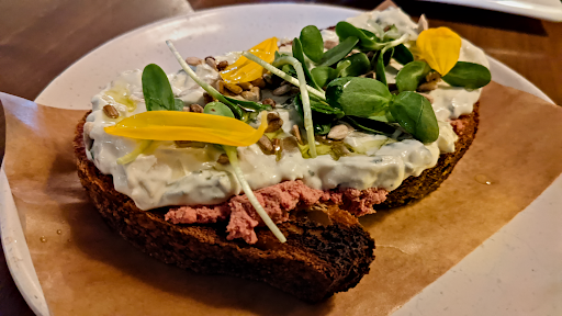 A smooth and savory chicken liver mousse topped with creamy artichoke dip on top, accompanied with a super crisp slice of sourdough bread and none of...