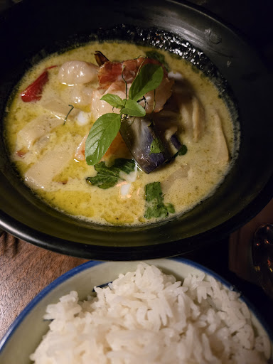 First time here. This place was highly recommended to me to try. First impression, host seemed a bit stand-off-ish when asking if we had resos, like he was dying to say there were no spots available without a reso. A bit presumptuous. Next place is very nicely decorated but seating is a bit cramped. The pathway behind my chair and the table behind me was too small and every time someone walked in between I could feel them brushing up on my chair. The tales are also very small! maybe like 2' X 4'? Waiter was ok. He didn't write down what we wanted and got the salad mixed up. I ordered a mango salad and they bought out a papaya salad. Waiter also did not check up on us after the first few bites to see if everything tasted good. He also refilled our water without asking me if I wanted another beer. Lastly, I asked the Waiter which of the curries was the least spicy, he told me the green. It was actually the spiciest of all the curries they had, another miss. This place just seem really pretentious and everyone working there had a chip on their shoulder. I didn't get a chance to record it but even the bartender was giving exact amounts for the drinks, like exactly 1 oz or exactly 2 oz. Most places when they pour out a shot there's always a bit of over pour but not this bartender. The papaya salad wasn't really good. The papaya was really from and not sweet. They also used some fish sauce in the papaya salad that really overpowered the flavour. Green curry was way too hot (even asked for mild spice). I had the braised pork belly. Nice flavours a bit sweet though. Saw the table beside us order the spring rolls and fresh rolls and man we were shocked!! It's 2 tiny spring rolls cut diagonally in half. The entire size of the spring roll was like 4 inches? So each half is only like 2 inches long but it cost over $2 for the 2 inches? Total is $17 for 2 small tiny spring rolls!! Wow. Even the fresh rolls were the same! 2 tiny fish rolls for $16 or $17? Pricing here is just outrageous! Overall I won't be retuning. I don't find the price worth the food or experience here. I don't want to recommend this place to other as well. It's just too pricey for what you get and what you get isn't even that great. The ambiance and service doesn't justify the price they charge. There are literally TONS of other thai places you can go into the city that will blow this place out of the water in terms of flavour...