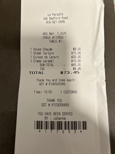 Read moreLe Paradis needs refreshing. The trouble with continuing to make something in the style of a place is that the place continues to grow and develop while the imitater gets stuck in a time warp. They need to revisit their menu choices, their decor, their attitude, and perhaps their chef. The frites were just soggy skinny fries. A French bistro can be forgiven a lot if they have great crispy, golden frites. And they were served with everything - even the liver dish - along with over-cooked green beans. I opted for a petit plat of spicy shrimp. The spice was nice but the shrimp were smaller than they should have been. They would have been a fine size for a seafood pasta dish, but not when they are the start of the dish. I would have preferred 6 Jumbo shrimp instead of the 12 medium sized ones I got, which also made it hard to get the tails off. It may be a personal preference of mine, but to leave the last section of shell and the tail on should only be done with a shrimp dish you are meant to eat with your fingers. It just makes me question whether the restaurant did any prep themselves or if they just dumped the pre-cooked shrimp out of the bag. Our meals weren't inedible but they were not up to anyone's standards. I think Le Paradis has been there so long that they are sitting on their laurels. I went often in the 1990s and enjoyed the meals I had, but I'm sad to say that last night's meal was a faint shadow of...