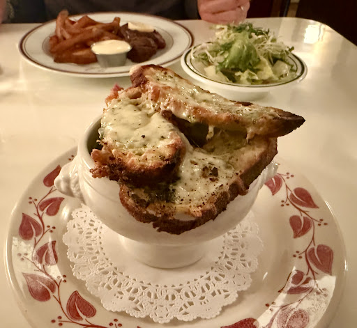 Read moreWalked by here for years and was always curious about what it would be like. Its menu for entrees is split in two, with ‘French’ and ‘Diner’ headings, with arguable equivalent pairings under each (ie beef bourguignon beside meatloaf and mash). I had the steak fruits with a side salad, and my daughter had the French onion soup. The portion size for the steak frites was quite small considering it was $39 without the salad. However, the steak was of the utmost quality (lean yet tender) and cooked to perfection. Additionally, the french fries had a nice fluffy yet crispy outer coating along with an unusual mashed potato-like texture inside. I wouldn’t say that there was a lot of flavour on the inside, but whatever oil they used resulted in a perfect outer texture. The contrast in texture between inner and outer was a unique experience for me. Surprisingly, the standout was the $5 side salad. It was diminutive in size, however, the selection of greens were an interesting combination for texture, and they included just the right amount of red onion, so that it wouldn’t overpower yet added a nice accent to the overall flavor. The most impressive aspect of this salad was the light dressing that reminded me of some of the best salad dressings that I’ve had in Germany. I tried some of the soup as well, but I felt that the broth was rather overpowering, and call me a traditionalist, but I prefer it when the melted cheese bread is resting directly on top of the soup. Service was very welcoming although our waiter was somewhat pushy/persistent with...